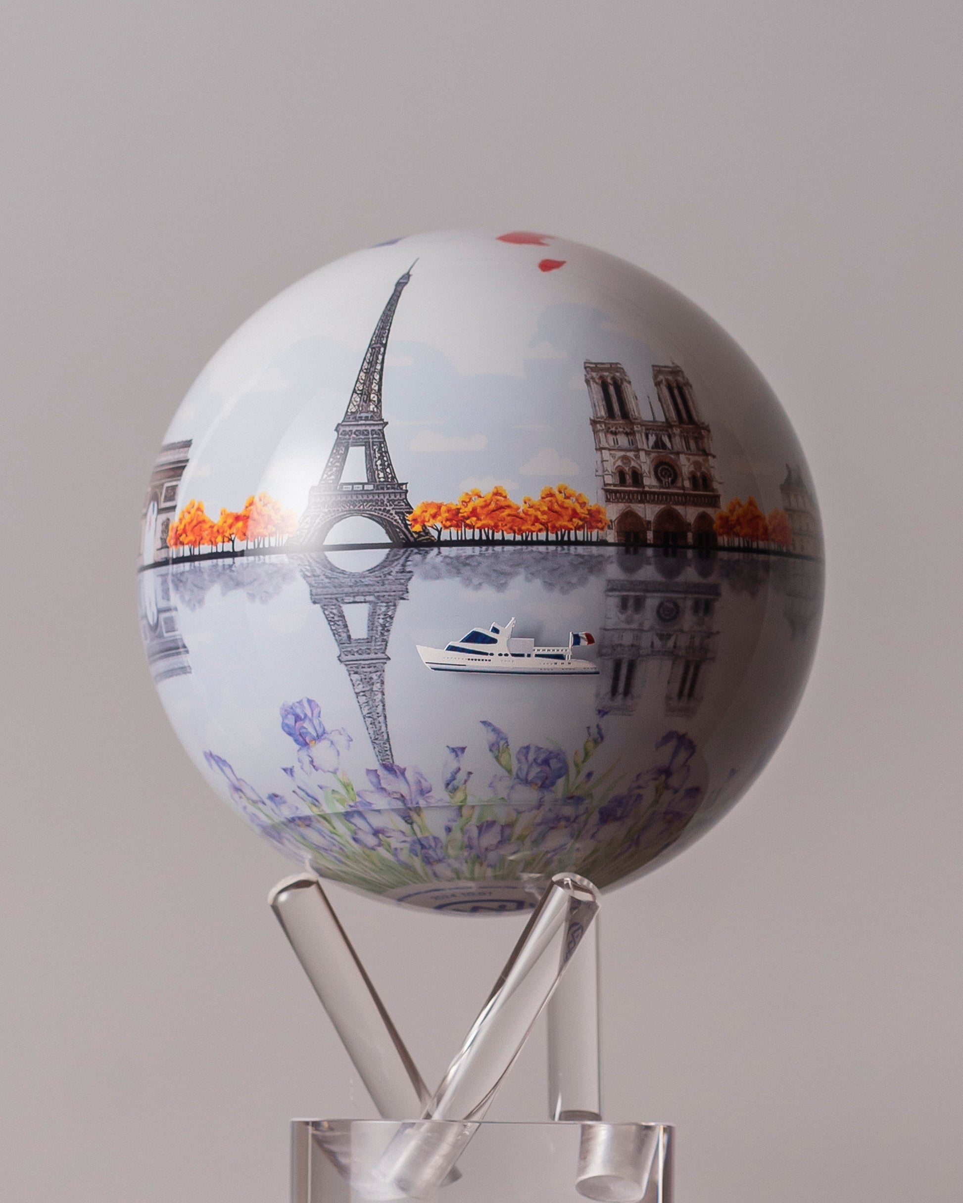 光の力だけで、透明な台座の上を静かに回り続けるMOVAグローブ (モバグローブ)。