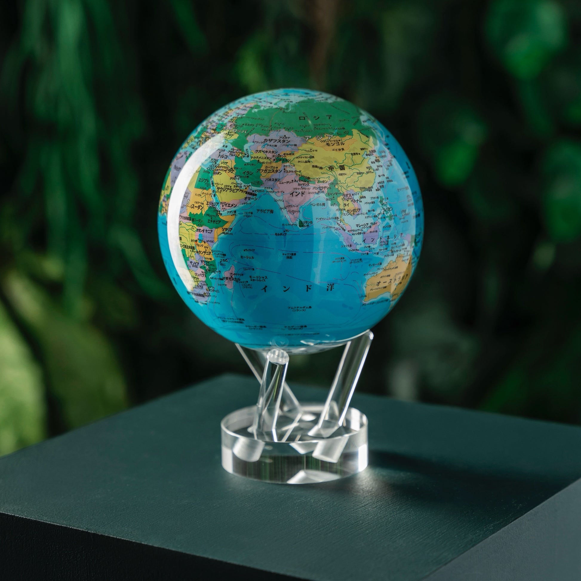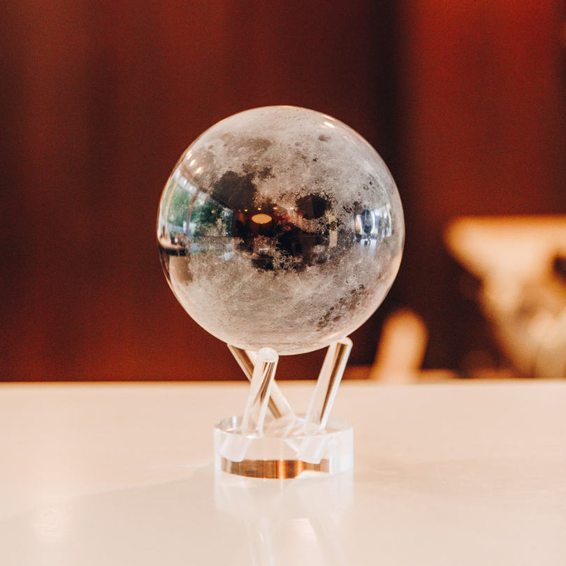 光の力だけで、透明な台座の上を静かに回り続けるMOVAグローブ (モバグローブ)。